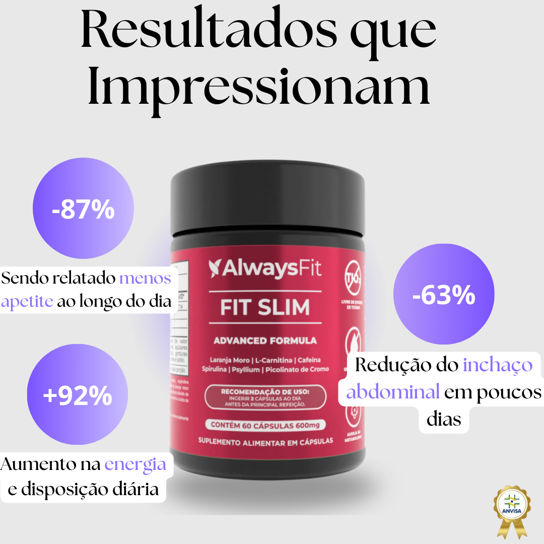O Fit Slim age direto na gordura mais resistente, acelerando seu metabolismo e reduzindo o inchaço já nos primeiros 7 dias — permitindo que você elimine peso de forma rápida, natural e sem precisar de academia.