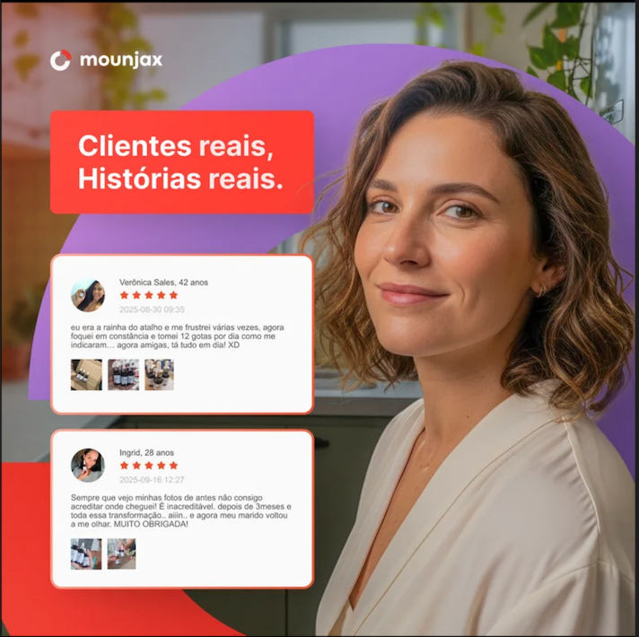 “Nunca me senti tão bem comigo mesma. O Mounjax realmente entrega o que promete.”